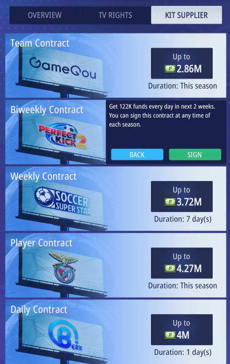 Разные спонсоры предлагают разные контракты с уникальными условиями, сроками, и некоторые могут требовать более высокий уровень лиги. Вы можете нажать для просмотра деталей контракта и сделать умный выбор based на вашем стиле управления.