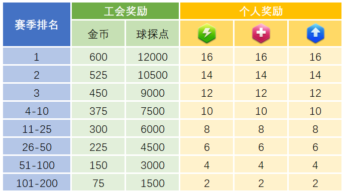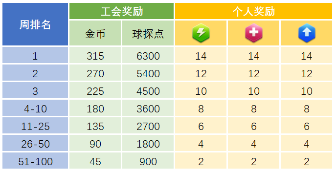 的公会可以获得周奖励。奖励分为公会奖励和个人奖励两种,公会奖励包含金币和球探点,会根据